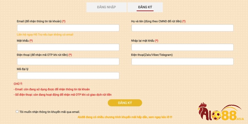 Sau khi truy cập vào địa chỉ của nhà cái, chọn phần “đăng ký Alo88”.